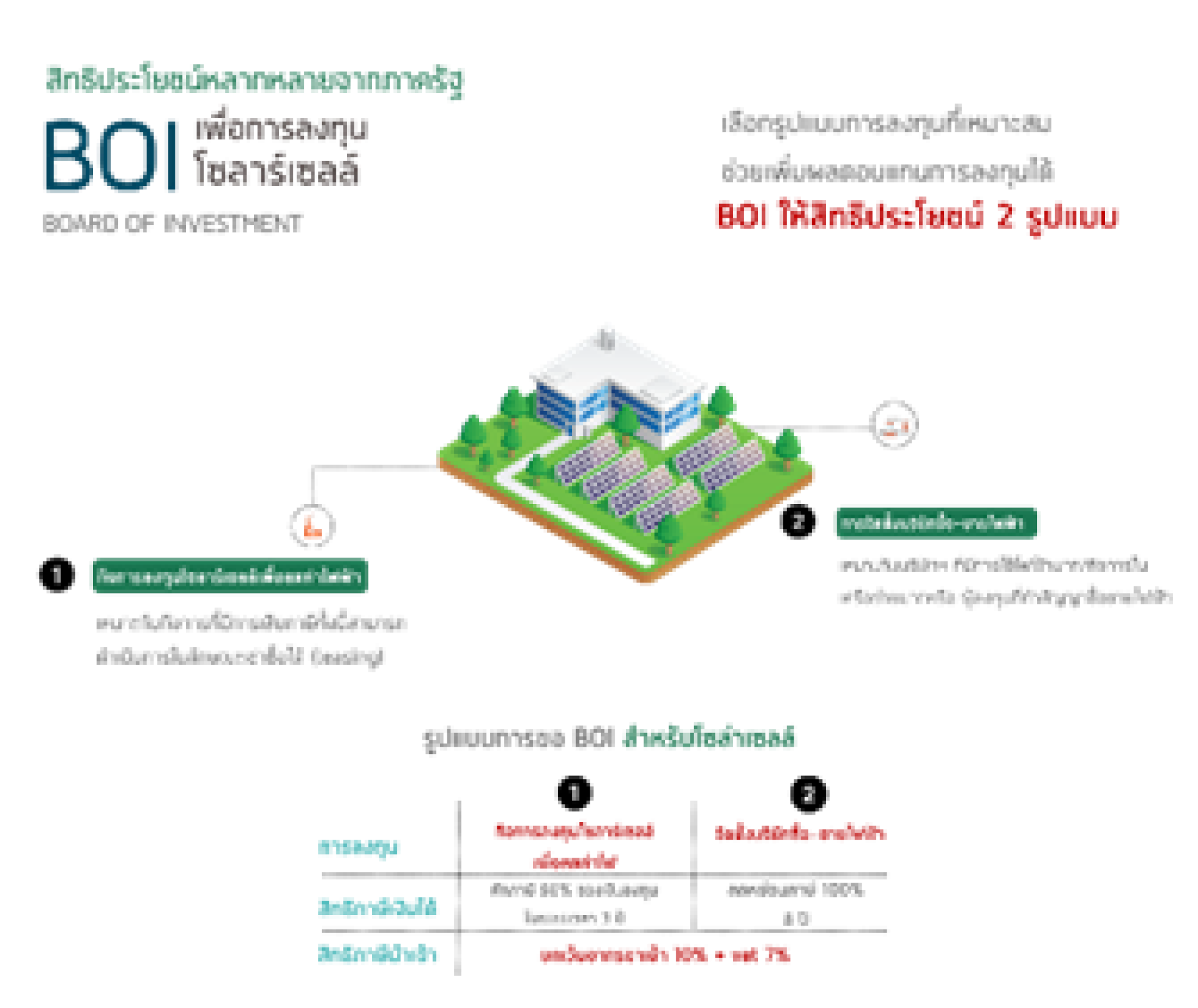 เนื่องด้วยโครงการผลิตไฟฟ้าจากพลังงานแสงอาทิตย์นั้น นับว่าเป็นทางเลือกของการใช้พลังงานสะอาด ซึ่งสอดคล้องกับการผลักดันของทั่วโลก เพื่อให้ใช้พลังงานหมุนเวียนเพื่อช่วยรักษาสิ่งแวดล้อม ทำให้โครงการดังกล่าวมีสิทธิประโยชน์ภาครัฐ ผ่าน BOI รวมถึงการสนับสนุนเป็นพิเศษจากสถาบันการเงิน